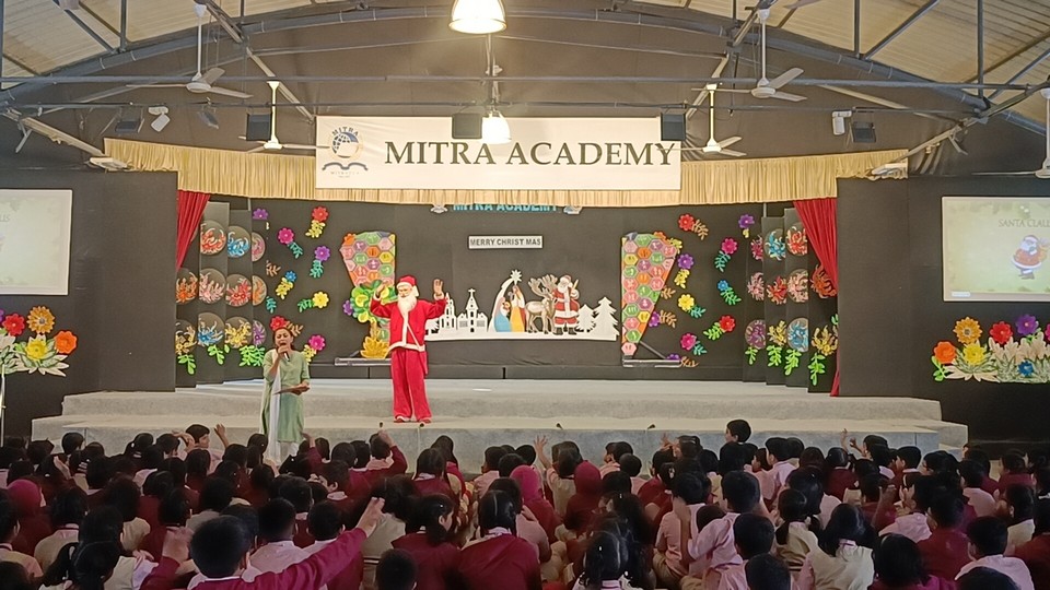 A special highlight of the programme was the appearance of Santa Claus, which brought immense joy and excitement to the children. Santa shared a few heart-warming moments on stage and extended his festive wishes, much to their delight. The celebration concluded with a thoughtful theme talk on the significance of various Christmas symbols by the in-charge teacher, reinforcing the values and deeper meaning of the festival. The assembly ended on a joyful note, leaving the children cheerful and in high spirits.