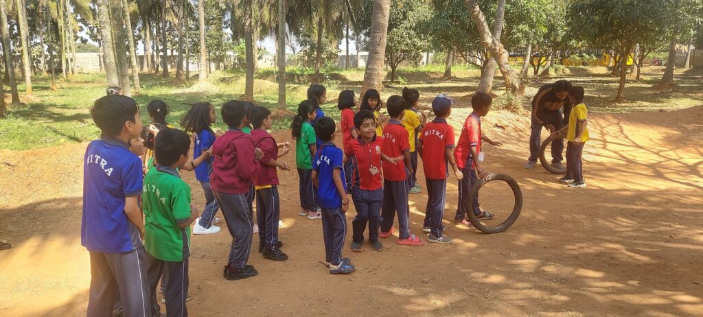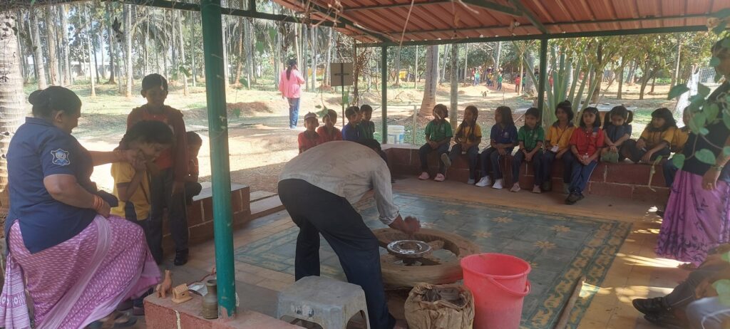 Class II students had a joyful and memorable picnic to Grameen Camp on Friday, January 23, 2026. The students and teachers left the school at 9:15 a.m. and reached the venue with great excitement. Upon arrival, the children were organised into groups and provided with coloured bands for easy identification during various activities in an orderly manner, followed by a healthy breakfast. The day was filled with fun and learning as the children took part in outdoor games in the play area, tyre race, Lagori and Snakes and Ladders. These activities helped build teamwork, coordination and confidence. At Halli Mane, the students explored Channapatna toys, learned about traditional grinding methods, natural colours and watched a pottery-making demonstration. A tractor ride and traditional games added extra cheer to the experience. The children enjoyed a delicious lunch followed by evening snacks before returning to school safely , carrying with them happy memories of a wonderful day filled with laughter, learning, and togetherness.