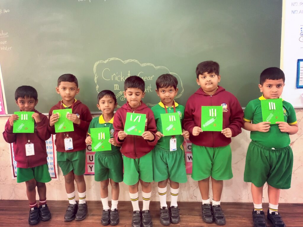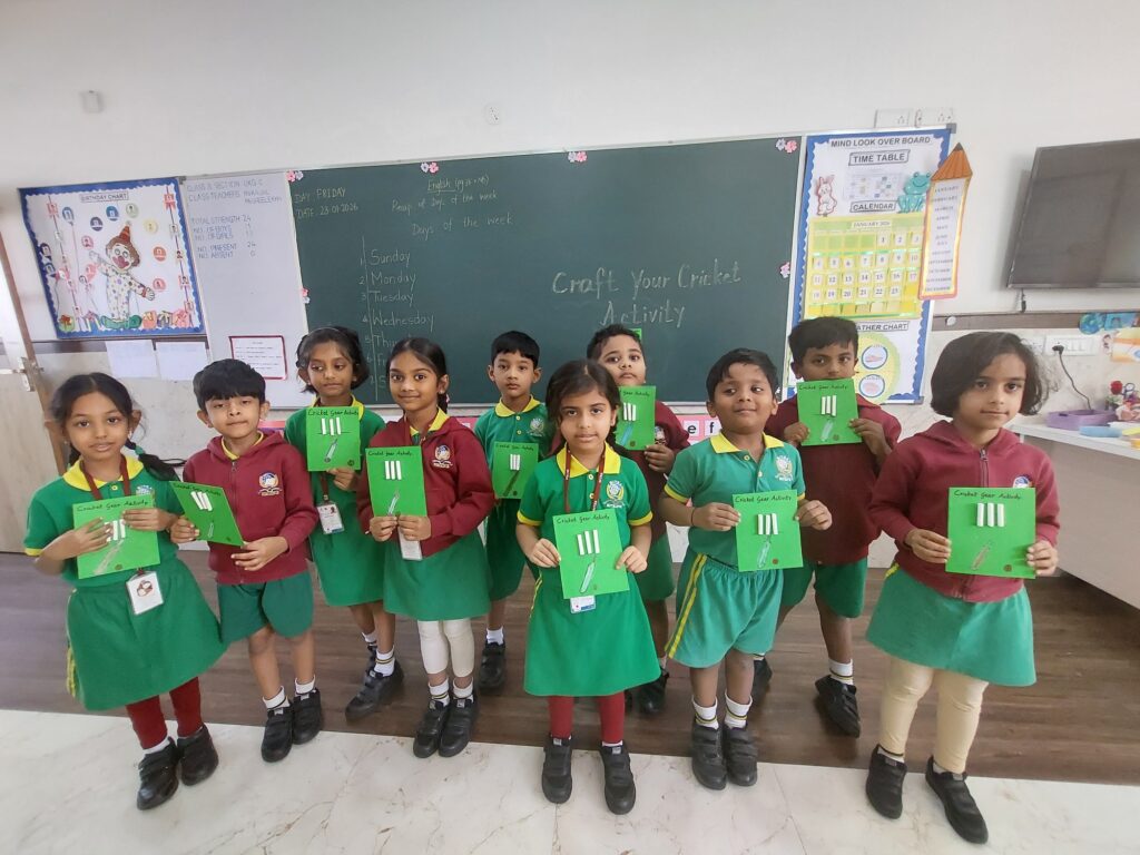 The Craft your Cricket Gear Activity introduced children to the exciting world of cricket. Teachers explained that cricket is an outdoor game played using a bat and ball, along with equipment such as stumps, pads, gloves and helmets. Each child received a green base card, straw pieces, glue and crayons. The children glued the straws to form stumps, drew a bat and ball, and coloured their artwork creatively. Every child completed their craft, which was personalised and taken home as a keepsake.