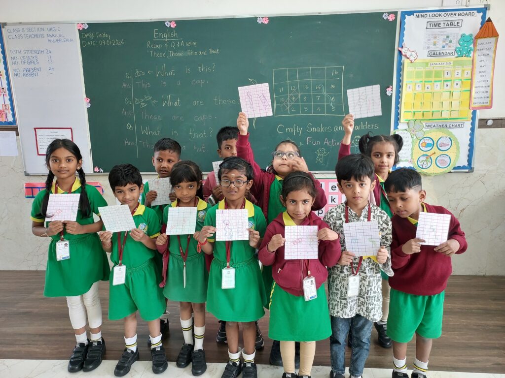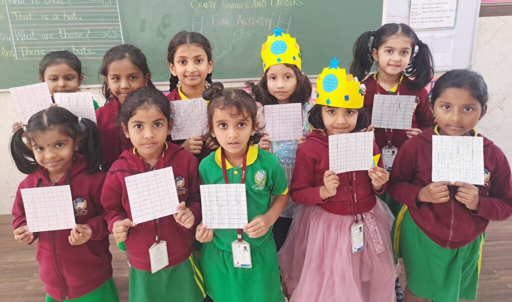 The Crafty Snakes and Ladders Fun Activity offered our UKG children an exciting blend of creativity and learning through play. Each child created a personalised game board by drawing a 10×10 grid, numbering it from 1 to 100 and designing their own snakes and ladders. They added colours and decorations to make their boards vibrant and unique. This beautiful hands-on activity strengthened numeracy skills, creativity and problem-solving, while giving children a sense of achievement as they proudly took home their very own game.