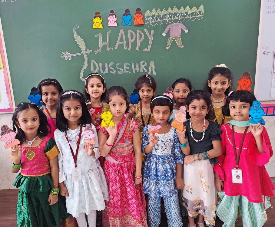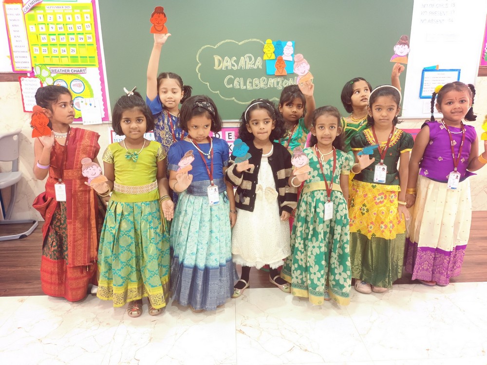 At Mitra Kinderworld, we joyfully celebrated Dasara with a vibrant and colorful cultural program. The entrance, stage, corridors, and stairs were adorned with flowers and traditional motifs, creating a festive ambience, while children and teachers dressed in ethnic wear added to the charm of the occasion. The program began with a brief talk by the teachers, explaining the significance of Dasara. Highlights included a Ram Lila skit performed by teachers, songs and shloka recitations to deepen understanding of the festival’s meaning, and a lively Garba dance that brought festive joy to all children. The celebration left a lasting impression, creating memorable experiences and nurturing a deeper connection to the cultural and moral values of Dasara.