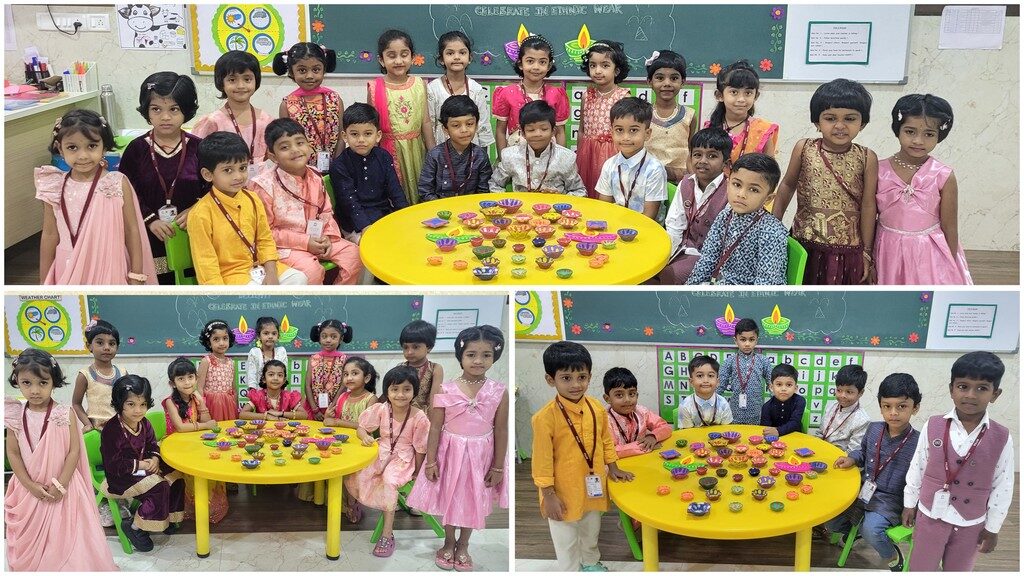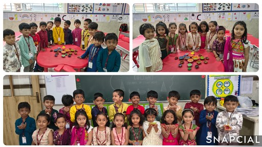 To celebrate the spirit of Diwali, the little ones joyfully painted their diyas using bright colours and creative patterns, enhancing their fine motor skills and artistic expression. The beautifully decorated diyas were displayed in the classroom, filling it with festive charm and pride. Later, the children carried their diyas home as a keepsake of their creativity and as a symbol of Diwali’s joyful spirit.