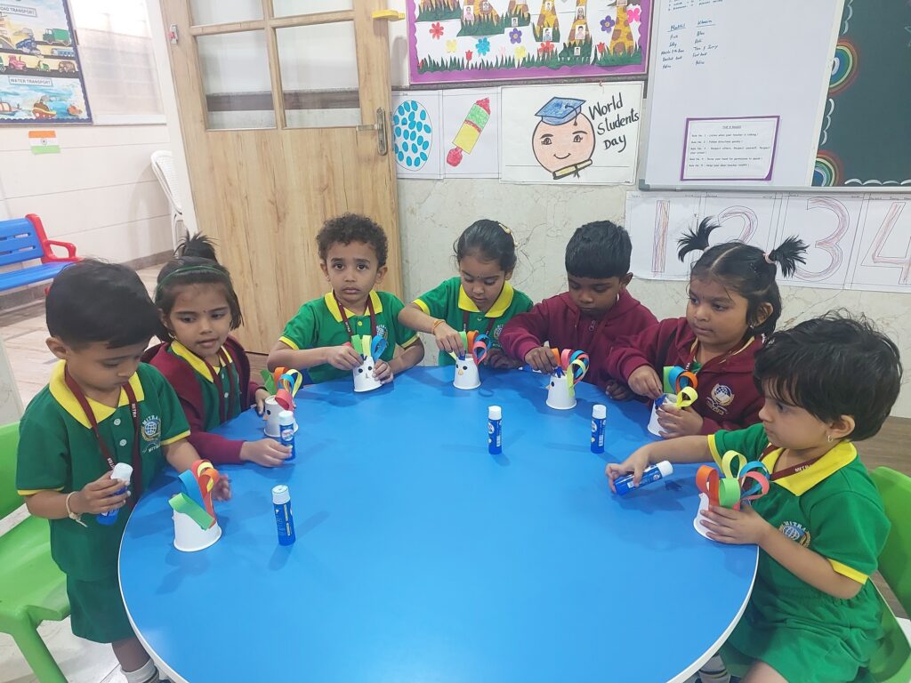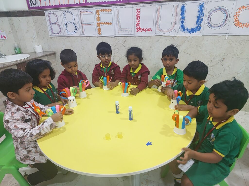 The Dancing Peacock Activity introduced children to India’s National Bird through a fun craft session. After learning about the peacock’s colours and features, children created their own peacocks using paper cups and colourful strips.They pasted the feathers, added eyes, beaks and decorative patterns. The children proudly displayed their creations and took them home as keepsakes, reinforcing learning while enhancing creativity and fine motor skills.
