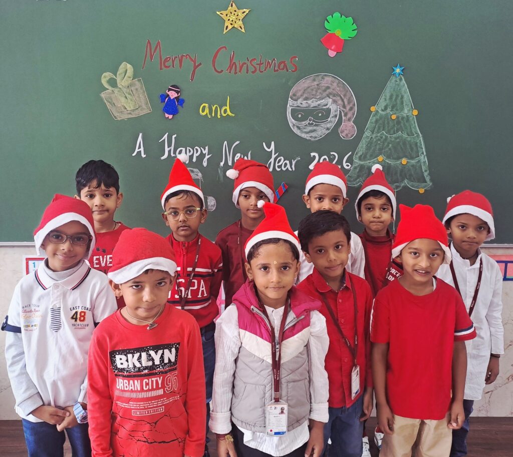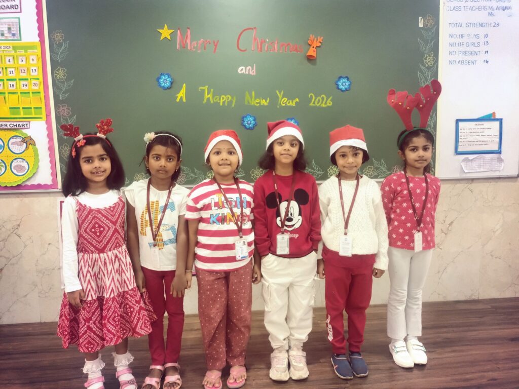 The Christmas celebration at Mitra Kinderworld was filled with joy, excitement and festive cheer. The Kindergarten lobby, corridors and classrooms were beautifully decorated with Christmas-themed cutouts, a snow-inspired setup and a sparkling Christmas tree, while teachers and children dressed in white and red added to the festive spirit. Children shared cupcakes with friends, spreading happiness and togetherness. A special assembly was held in the KG Auditorium, featuring a heart-warming Nativity musical skit and a joyful Christmas dance. Santa’s grand entry was the highlight of the celebration, filling the auditorium with laughter and delight as children greeted him with hugs and cheerful wishes. The celebration was a memorable experience that blended learning, joy and the true spirit of Christmas.
