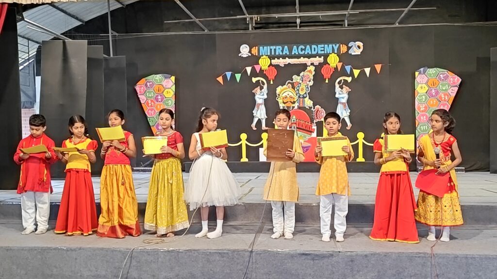 The Lower Primary Section conducted a special assembly on Tuesday, November 04, 2025, to celebrate Kannada Rajyotsava and Kanakadasa Jayanti with great enthusiasm and pride. The programme aimed to instill love and respect for the Kannada language and culture among the students while remembering the contributions of the great saint-poet Sri Kanakadasa. The assembly began with the School Hymn, followed by the Thought for the day and facts on Kanakadasa Jayanti, sharing insights into his life, devotion, and literary works that spread the message of equality and humanity.The students showcased their talents through a patriotic group song in Kannada and a vibrant dance performance that reflected the rich culture and tradition of Karnataka. The colourful costumes and graceful movements added charm to the celebration. The assembly concluded with the State Anthem, filling everyone’s hearts with pride for the state and its glorious heritage.