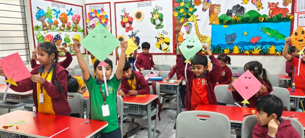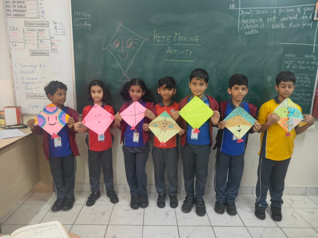 Makar Sankranti is celebrated with great enthusiasm across the nation on 14th January every year. To mark this festive occasion, a Kite Craft Activity was conducted for the Lower Primary students on Tuesday, January 13, 2026. The students created colourful kites using A4 coloured paper, showcasing their imagination and artistic skills. They decorated their kites creatively with sketch pens, glitter and paper strips. The activity filled the atmosphere with joy and excitement, bringing bright smiles to the students’ faces. Their enthusiasm and active participation made the event truly memorable.