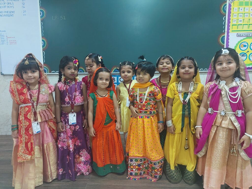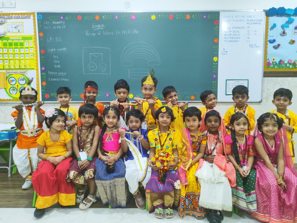 Janmashtami was celebrated with great enthusiasm at Mitra Kinderworld. The classrooms turned into little Brindavans as our tiny tots came dressed as Krishna, Radha and Meera, filling the atmosphere with devotion and joy. The beautifully decorated lobby transported everyone to the mythical world of Gokul. Children also coloured Janmashtami-themed worksheets and proudly displayed them in their classes, while sharing the festive spirit with friends through sweets and savouries.