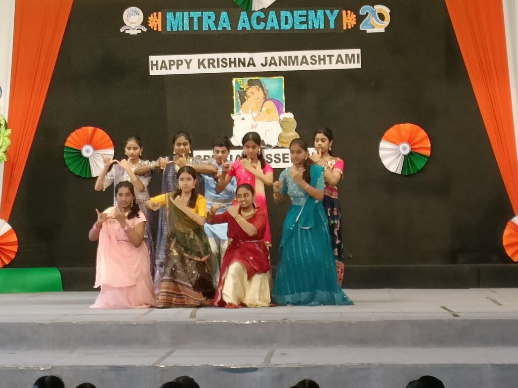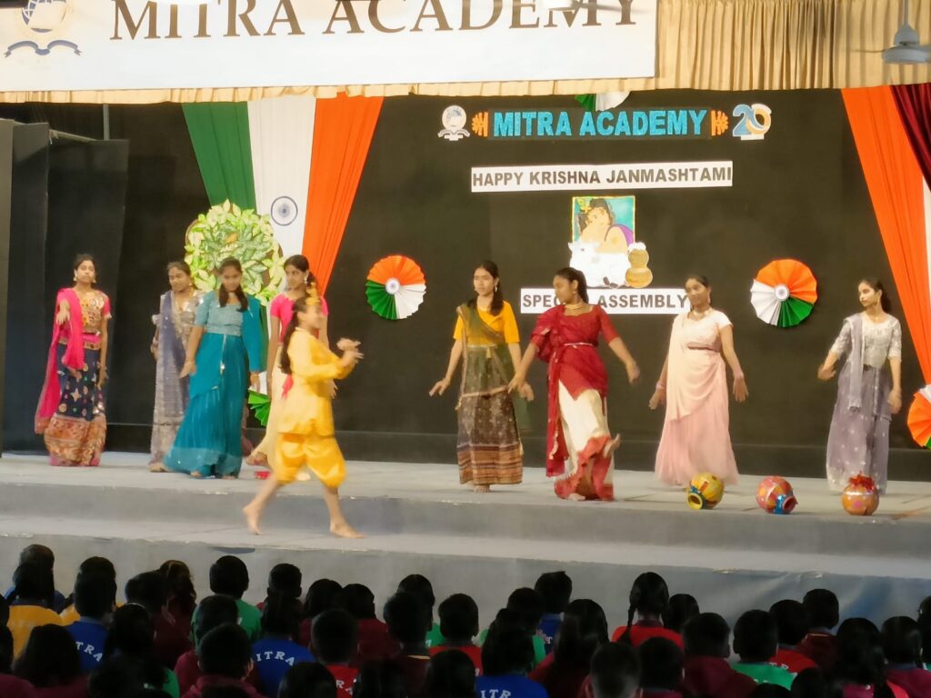 Mitra Academy celebrated Krishna Janmashtami with devotion and enthusiasm on Tuesday, 20th August 2025 during the morning assembly by Std IX-D. The program began with a Teacher’s Talk highlighting Lord Krishna’s teachings, followed by Thought for the Day, news updates and a poem on Lord Krishna. The main attraction was a vibrant dance-drama depicting events from Krishna’s life including the teachings in the Bhagavad Gita. The assembly concluded with a Student Talk on the festival’s importance and a devotional shloka, leaving all inspired.