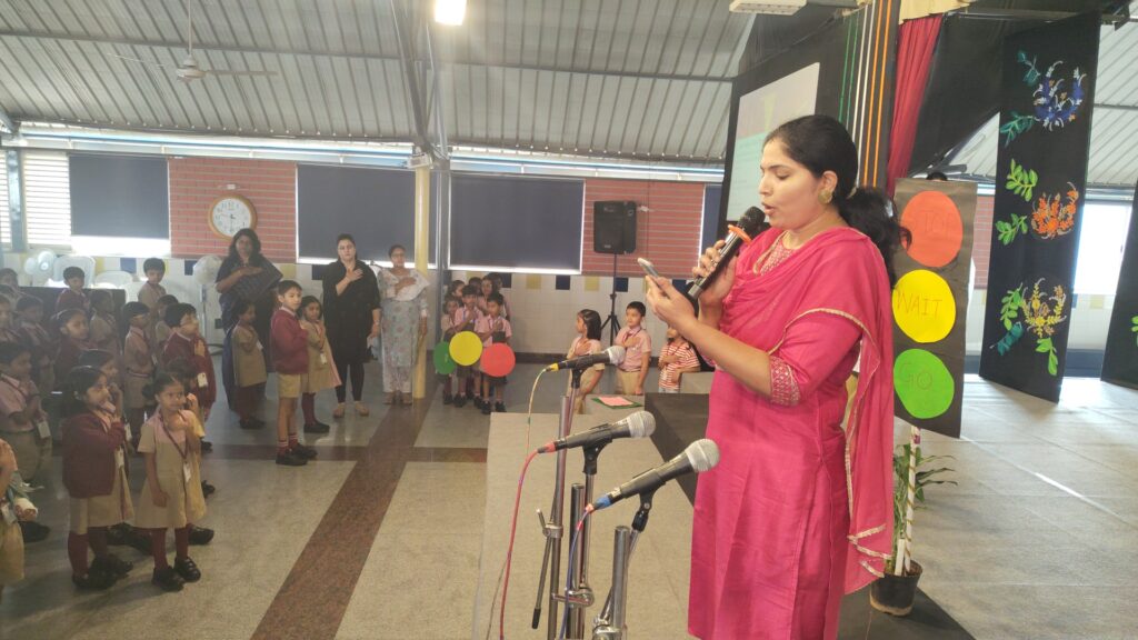 A special assembly on Road Safety was conducted to help students understand the importance of following traffic rules and staying safe on the road. The assembly began with an introduction and the Thought for the Day, “Safety is a habit—start young and stay safe!”.Students were made aware of essential road safety rules, including the proper use of traffic lights, zebra crossings, footpaths and the importance of wearing helmets and seat belts. These rules were effectively reinforced through a student role play titled “Road Safety with Tia & Tofu,” which showcased correct and incorrect road behaviours in an engaging manner.An action song, “Red Light, Red Light,” added a fun element while helping students remember traffic signals. The teacher concluded the assembly by stressing the importance of road safety and encouraging students to follow these rules in their daily life. The assembly ended with a Road Safety Pledge, where students promised to follow traffic rules and ensure their own safety as well as that of others.