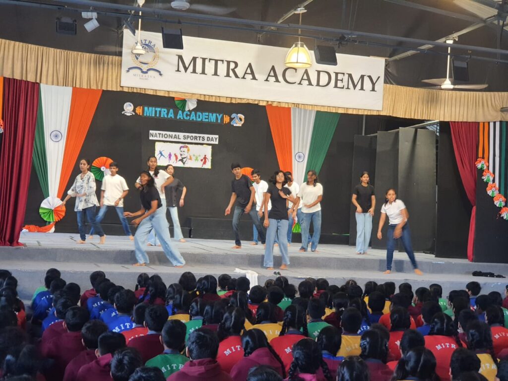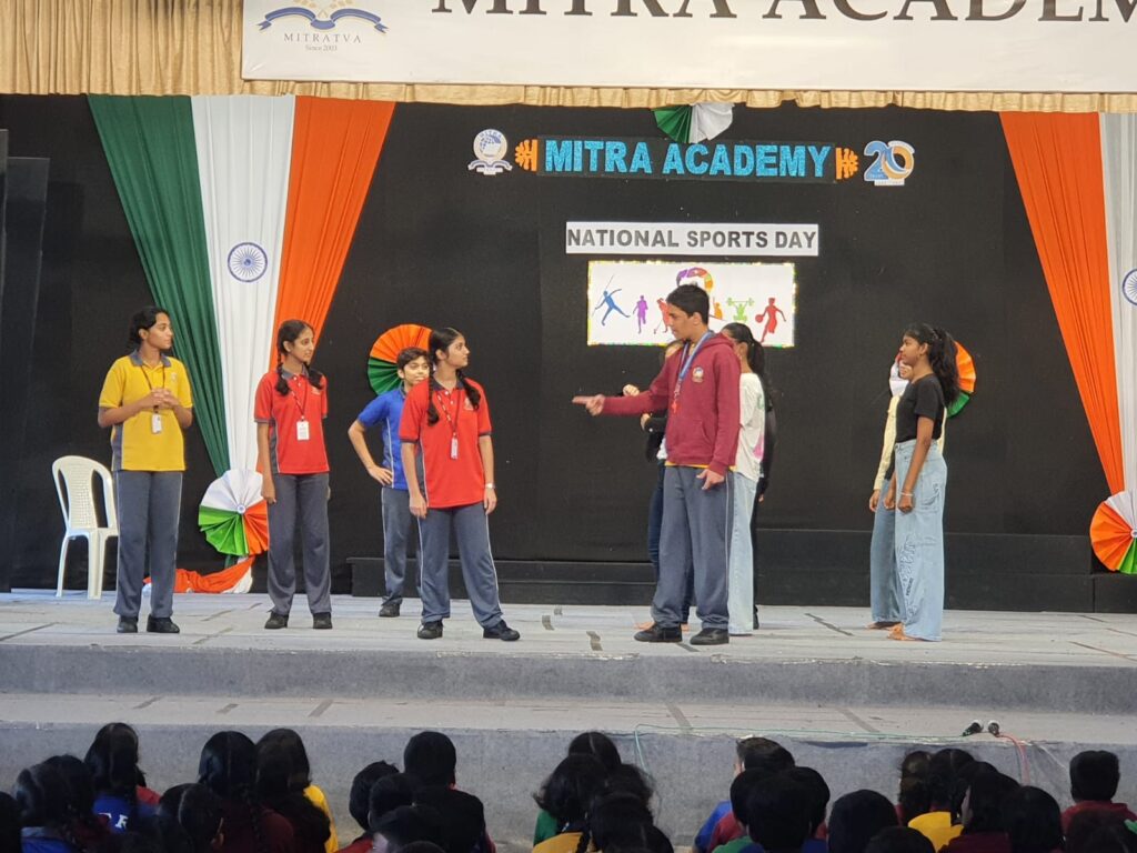 A skit was performed showcasing the value of physical activities over online games. An energetic dance performance and a melodious rap song added liveliness to the event, spreading the spirit of enthusiasm and unity. The P.E. teacher, Mr. Girish spoke on the significance of the day. The assembly concluded with all the participants and students taking a pledge together, promising to participate in sports and fitness activities. Overall, the celebration of National Sports Day was inspiring and instilled in students the true spirit of sportsmanship, fitness, and dedication towards the nation.