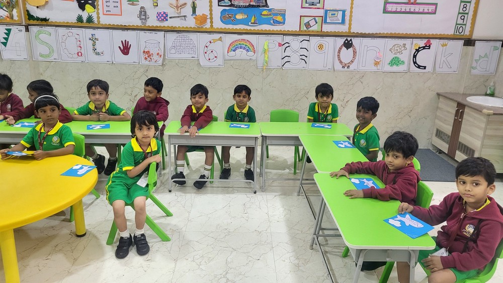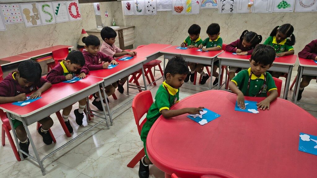 The LKG children participated in the Paper Plane Parade Craft Activity, a fun and creative way to explore the concept of aeroplanes while developing fine motor skills. Teachers introduced the activity by explaining how aeroplanes help people travel, showing a finished model as a reference. Each child received pre-cut aeroplane and cloud shapes, crayons for colouring and glue to assemble their artwork. The children enthusiastically coloured and decorated their aeroplanes before gluing them onto a sky-themed base alongside the clouds. The activity encouraged creative expression, enhanced hand-eye coordination and helped children identify basic features of an aeroplane.