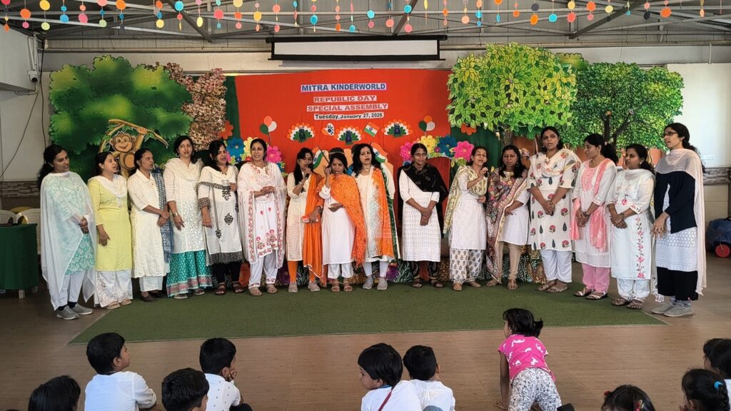 Mitra Kinderworld celebrated the 77th Republic Day with great enthusiasm and pride. Children and teachers dressed in white and off-white, while the Kindergarten block was adorned with tricolour festoons and thematic cutouts, creating a vibrant patriotic ambience. The celebration featured student speeches, creative classroom activities and a special assembly where teachers highlighted the significance of Republic Day and the Constitution, followed by musical and action song presentations. The event concluded with the National Anthem, filling the atmosphere with unity and national pride.