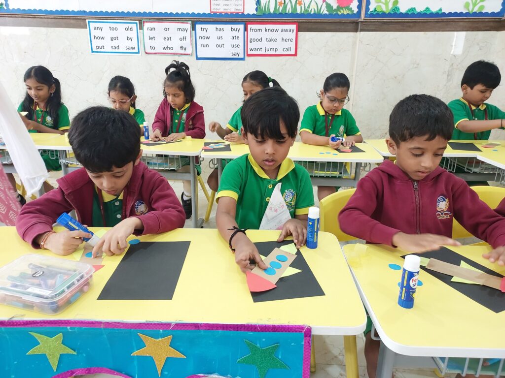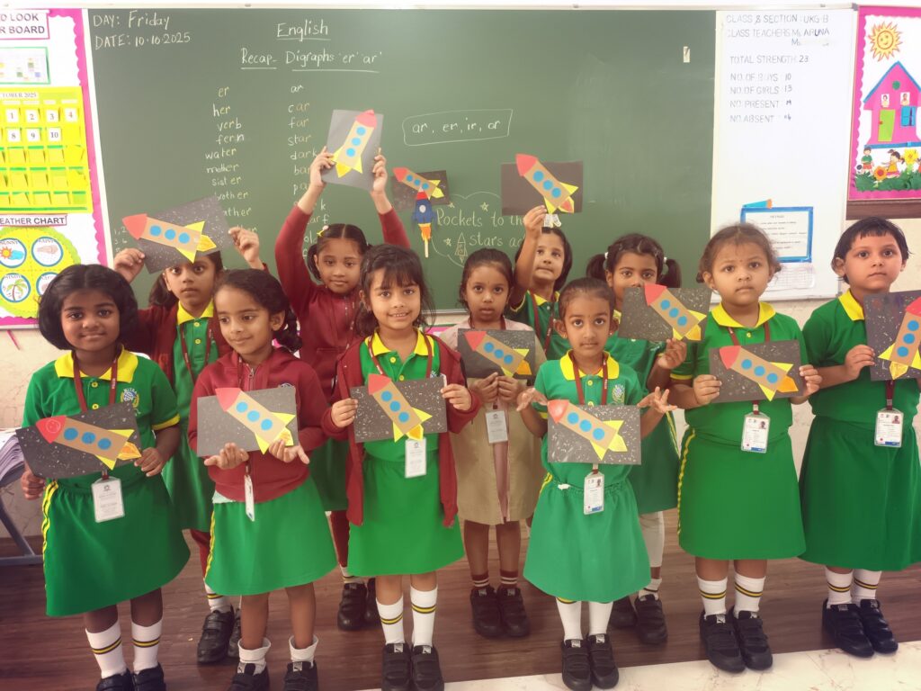 Our Upper Kindergarteners had an exciting time during the Rocket to the Stars Activity, where imagination took flight! Children assembled their own rockets using precut shapes for the body, fins, nose cone and flames. With their teachers’ help they carefully glued the pieces onto black sheets and added creative touches with crayons, glitter and stickers. The little space explorers proudly displayed their colourful rockets, which were sent home as delightful keepsakes. This activity sparked their imagination, enhanced fine motor skills and filled the classroom with joy and excitement.