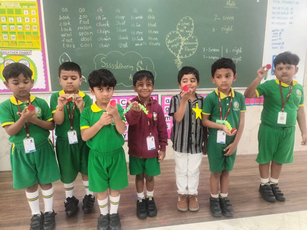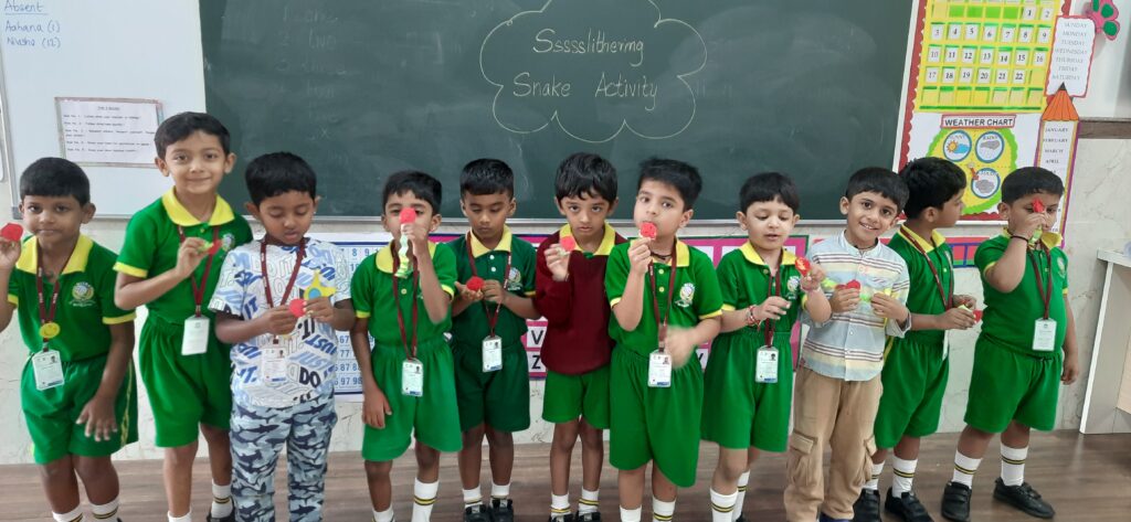 Our little ones from UKG enjoyed a creative Slithering Snake Craft Activity, where they transformed colourful paper strips into playful snakes. The children carefully folded, glued and decorated their snakes with eyes and forked tongues. This activity not only sparked their creativity but also helped them practice fine motor skills, sequencing, and pattern recognition. With great pride, the children carried home their vibrant snake crafts as a joyful takeaway.
