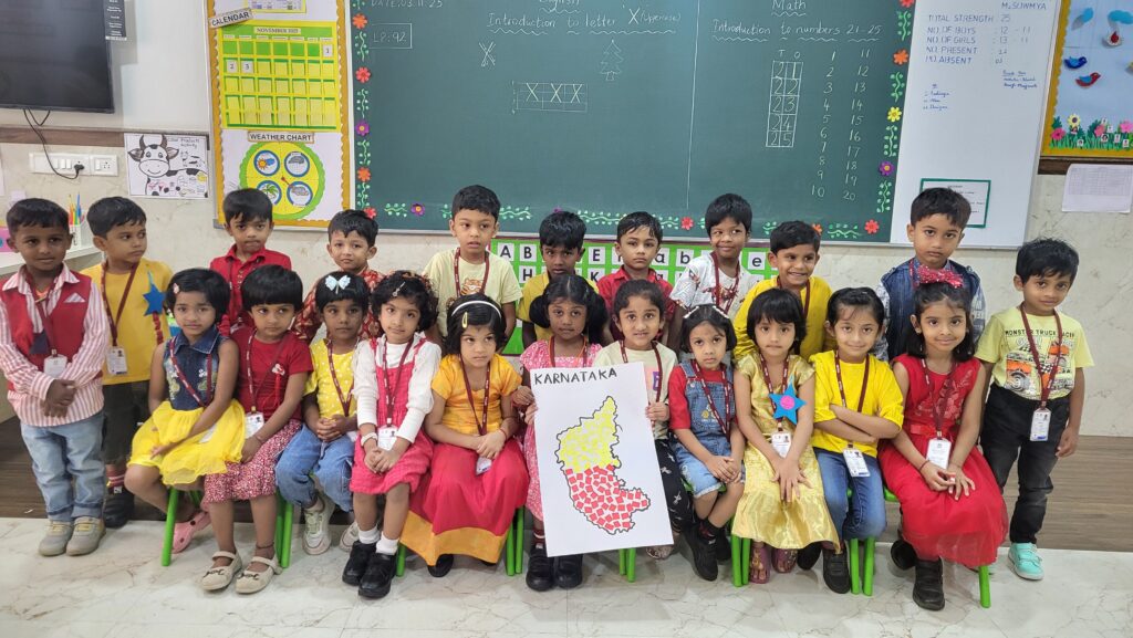 Karnataka Rajyotsava was joyfully celebrated at Mitra Kinderworld. The corridors and auditorium were beautifully adorned in vibrant red and yellow, with a striking map of Karnataka adding to the festive ambience. Children and teachers arrived dressed in traditional Rajyotsava colours, enhancing the spirit of the celebration. The programme began with the school prayer, followed by teachers sharing insightful reflections on the significance of the occasion. A few students from each class expressed their thoughts, making the event meaningful. A lively teacher performance featuring a cultural dance and a patriotic song further highlighted Karnataka’s rich heritage. The celebration concluded with the National Anthem, bringing everyone together in a moment of pride and unity.
